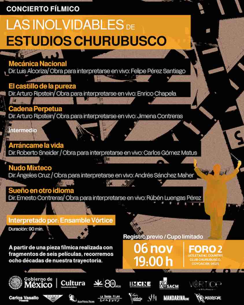 El concierto fílmico es una pieza realizada con fragmentos de 6 películas que forman parte del ciclo de cine Las inolvidables de Estudios Churubusco, cada una de ellas será musicalizada en vivo por Vórtice Ensamble, la duración del concierto fílmico es de 90 minutos y se llevará a cabo el jueves 06 de noviembre a las 19:00h en el foro 2 de los Estudios Churubusco, el evento es público y no tiene costo.