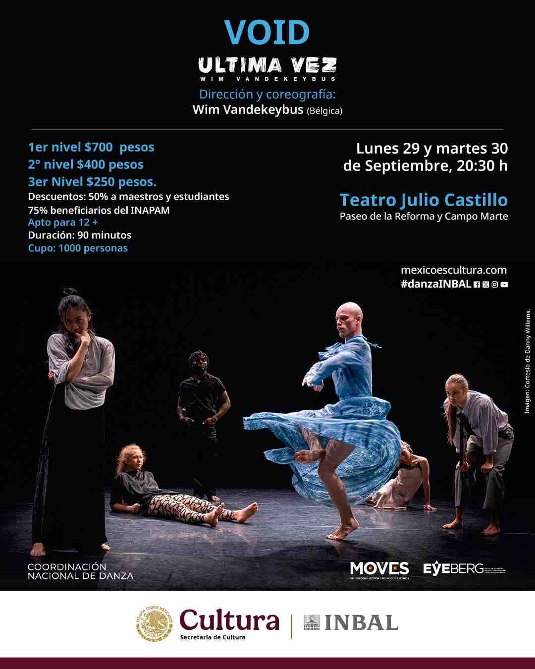 VOID, tendrá dos únicas funciones, lunes 29 y martes 30 de septiembre a las 20 h en el Teatro Julio Castillo, los boletos tendrán un costo $700 primer nivel, $400 segundo nivel, $250 tercer nivel con los descuentos establecidos y se podrán adquirir en taquilla y en la pagina https://teatroinbal.sistemadeboletos.com/?search=void